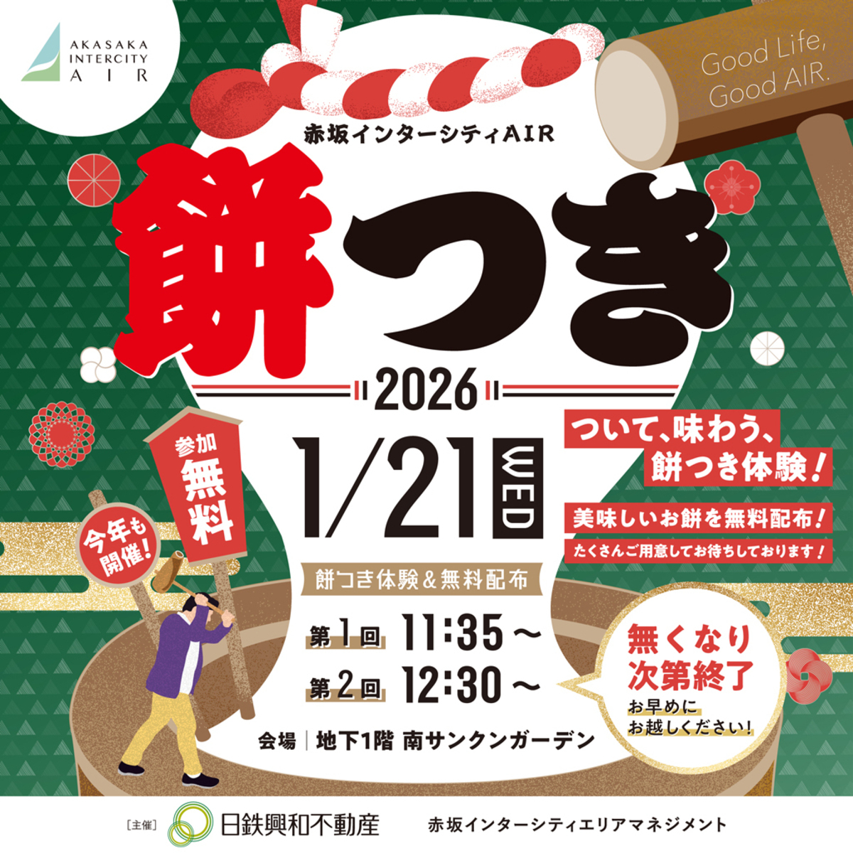 今回も、皆さんに元気をお届けしたく、つきたてのお餅を無料で配布いたします。